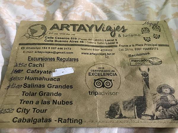 行程:早上七點出發→沿路景點→Cafayate鎮上自由活動(不包含午餐)→酒莊品嚐白酒→Salta市區