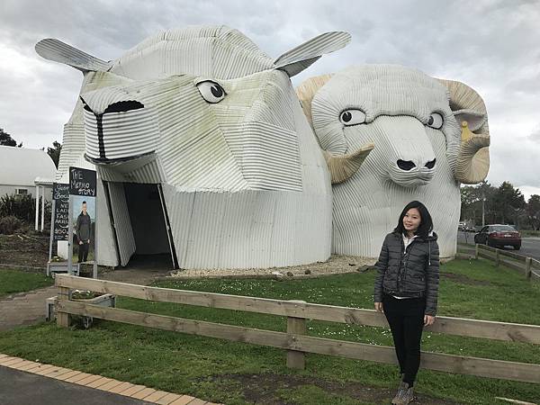 浪板之都這城鎮的特色就是招牌幾乎使用波浪板材質,可愛的大狗造型裡頭其實是一間旅遊服務中心,旁邊的建築則是兩頭白目羊造型,藝人吳奇隆和劉詩詩到紐西蘭拍攝婚紗時,這個城鎮也是取景點之一