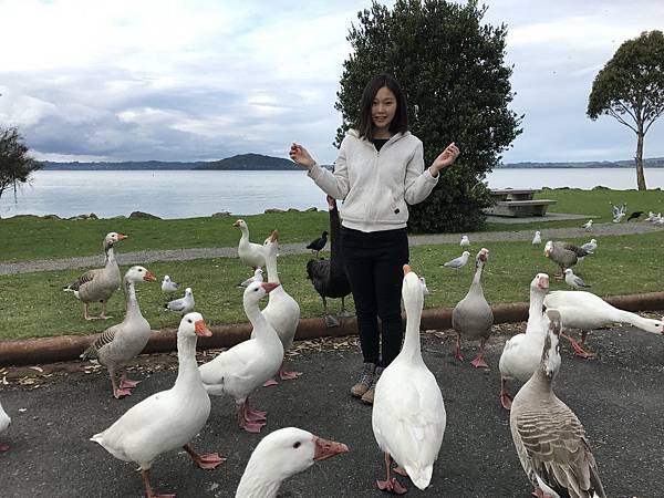 從政府花園開車兩分鐘可以到達湖邊Lake Rotorua,這是紐西蘭第二大的湖泊,那邊有許多鴨子和海鷗可以餵食,不過要注意他們搶食很兇
