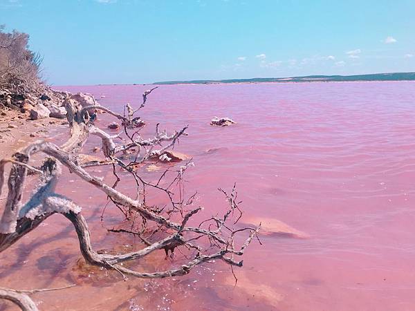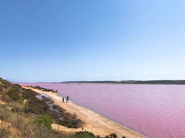 位在伯斯以北的Port Gregory, 面積有2,500公頃,根據科學家推測, 湖水內因為有特殊的細菌,使得湖水中自然產生β胡蘿蔔素,讓湖水呈現絢麗的顏色,但有時天氣的變化加上光線折射角度不同,湖水的顏色會產生變化,還有季節轉變會讓湖水鹽度不同,這些也會影響藻類的繁殖程度,沿著海岸邊散步,看著粉紅湖相當浪漫,拍照加上欣賞風景時間,可停留約一小時