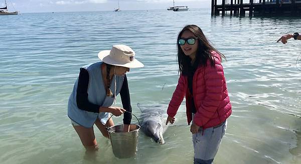 教大家如何增加機會被工作人員選上餵食海豚,穿著容易形容的服飾像是單一顏色的衣服、帽子或亮色系服裝,我是看了兩場後,第一場沒被選到,第二場觀眾少很多,當天又穿著亮色系就被選上了,如果真的很想餵食海豚,建議到昆士蘭的摩頓島,在那裡海豚每晚都會前來沙灘,每一位遊客有一次餵食的機會