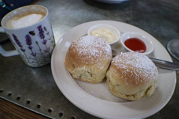 另外薰衣草冰淇淋,看起來就相當療癒,吃起來還能嘗到濃濃薰衣草味道,如果怕味道太單調,沒關係他還有綜合口味,藍莓薰衣草、黑巧克力薰衣草,單球AUD5、雙球AUD9,我點的是藍莓薰衣草,雖然店員挖得好醜,但他給我超大一球的,另外我們還點了薰衣草司康,飄著淡淡的薰衣草味道,搭配附上的奶油和紅莓醬,增添味道層次,一份有兩個司康,AUD7.5