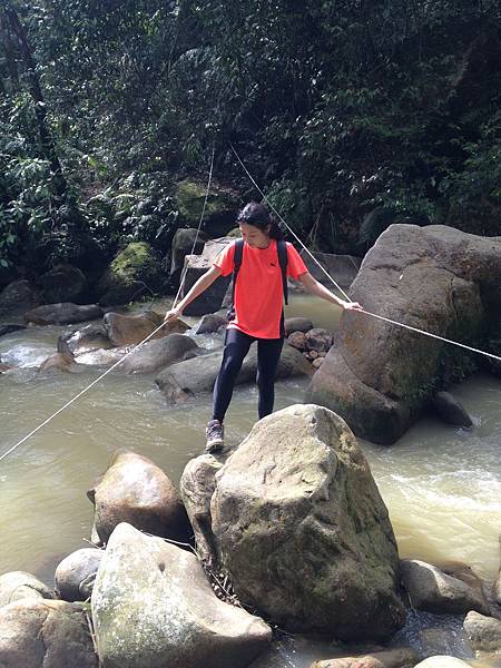 走大概十分鐘後會遇到叉路,一邊是友蚋山另一邊是新山,這次要走的路線是友蚋山,首先要抓著兩條繩子踩著石頭跨越溪流