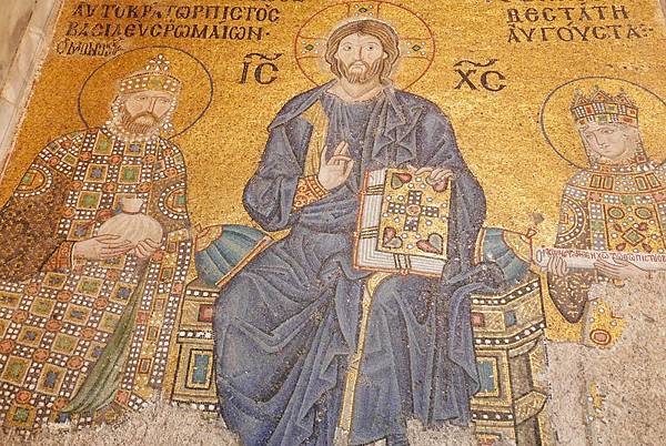 在南樓座東側牆壁上的女皇佐伊馬賽克出自11世紀,鑲嵌畫上的基督聖像身穿深藍色長袍,身穿禮服的君士坦丁九世和佐伊女皇分別在耶穌的左右側