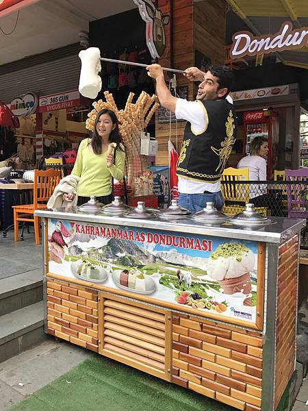來土耳其怎麼能錯過土耳其冰淇淋Dondurma,是土耳其的名產之一,最大賣點在於攤販老闆會在製作冰淇淋的同時與客人進行互動,用各種戲法讓客人以為老闆要給你冰淇淋,,卻又收手和你玩其他花招