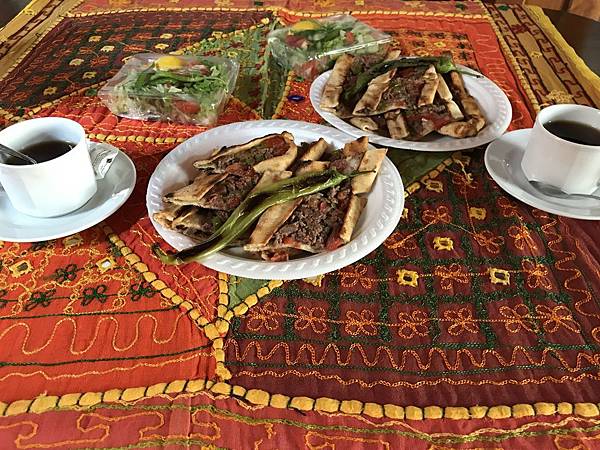 原本船型的披薩卻因為是外送所以店家已經幫我們切片了,薄皮現烤出爐搭配土耳其風味內餡相當好吃