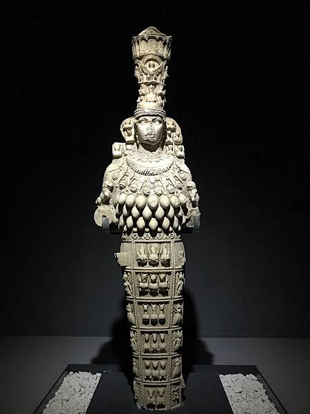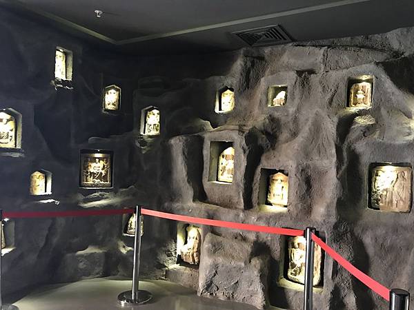 博物館戶外長廊上展示多座雕像、石棺和柱子的部分雕刻作品
