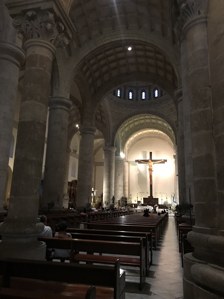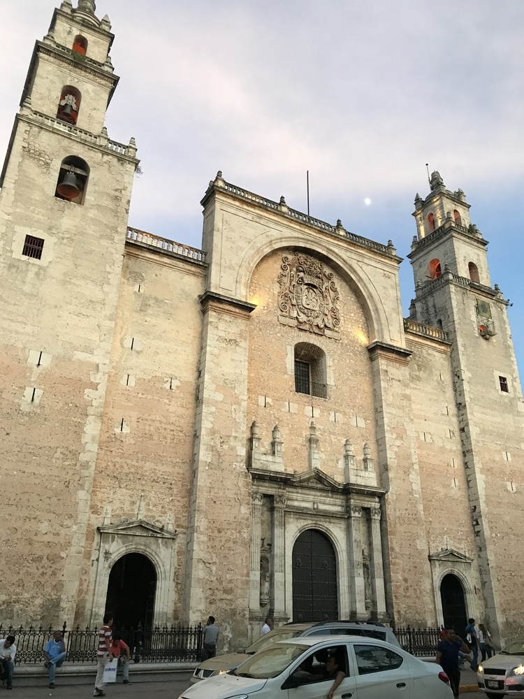 梅里達市中心廣場的大教堂,建於16世紀是美洲第一座完成的大教堂,也最古老的教堂,這個殖民地教堂都是使用古代瑪雅神廟的遺物建造的