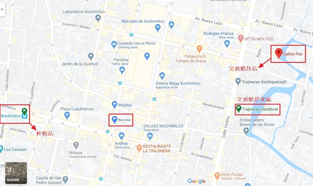 首先要先搭乘地鐵到藍色線的最終站TASQUEÑA,出站轉搭輕軌由TREN LIGERO站到XOCHIMILCO站下車,再步行約15~20分鐘即可到達岸邊