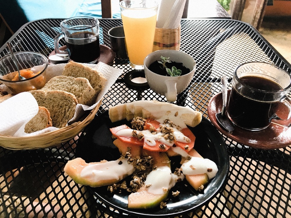 圖片是住宿附贈的早餐,每天水果、麵包會變化,飲料可以選擇黑咖啡或果汁,墨西哥的咖啡都比較偏酸,麵包雖然一人只給兩片但因為很扎實吃完很有飽足感,搭配手工果醬(芒果或桃子口味)