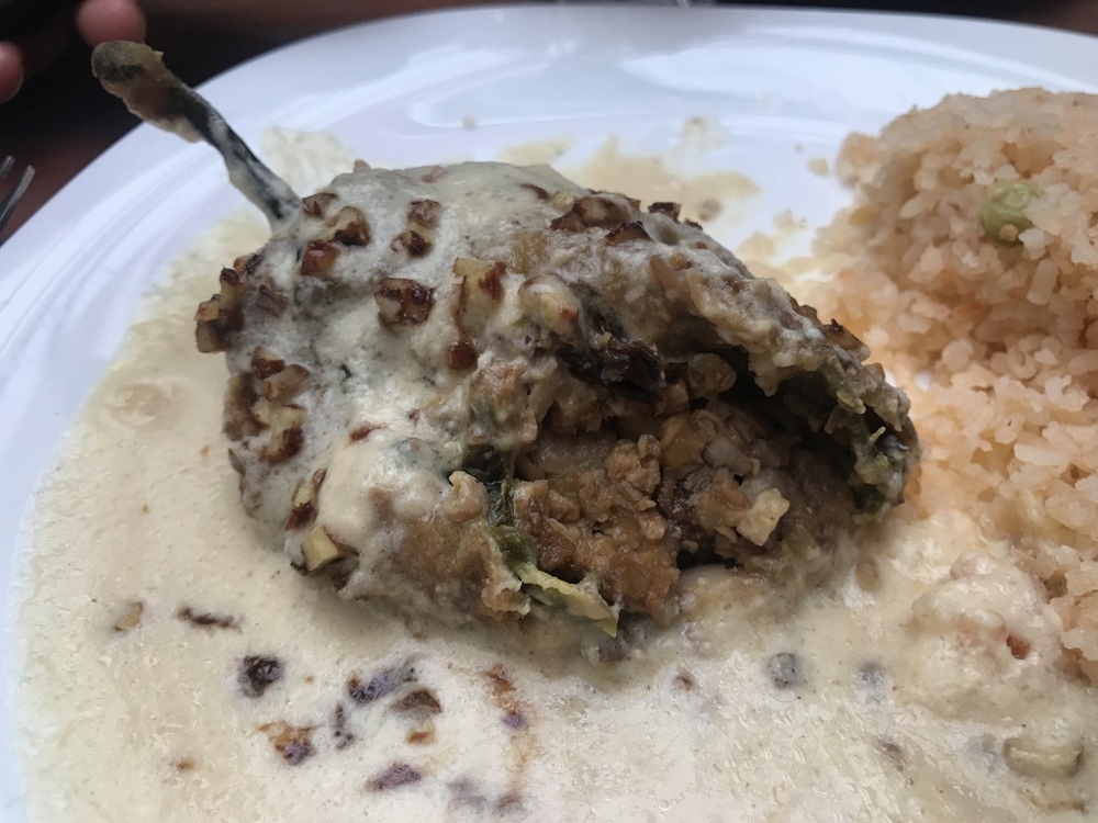 在市區隨便找了一家餐廳「Restauran El Patio」,點了這道料理,一份$100Peso,送上桌時有點傻眼,跟照片上的顏色完全不一樣,乳白色醬汁完全覆蓋青椒,也沒有放紅色石榴