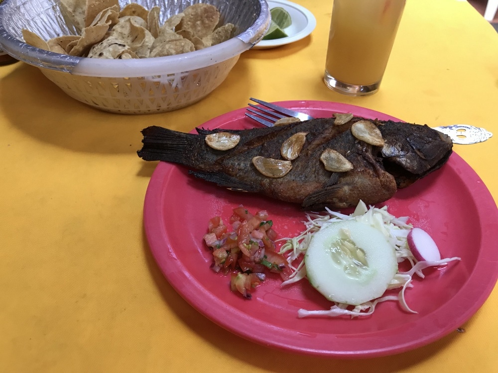 套餐價格$70Peso,包含主菜(魚或肉)、鐵板肉(兩人以上才有)、小杯蝦湯和飲料(選啤酒可換兩杯),免費吃到飽的玉米片
