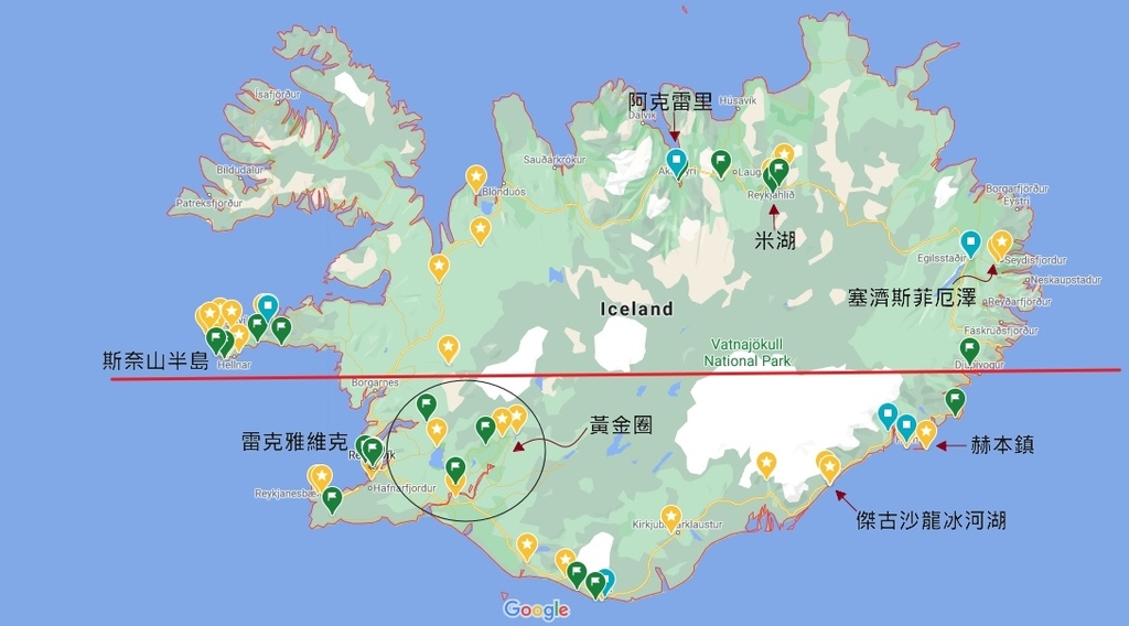 這篇是介紹地圖紅線的上半部,由赫本鎮出發繼續往北前進,景點介紹也會照這樣的路線排序,分別是Djúpivogur小鎮→塞濟斯菲厄澤Seyðisfjörður→米湖Mývatn→阿克雷里Akureyri→斯奈山半島Snæfellsnes