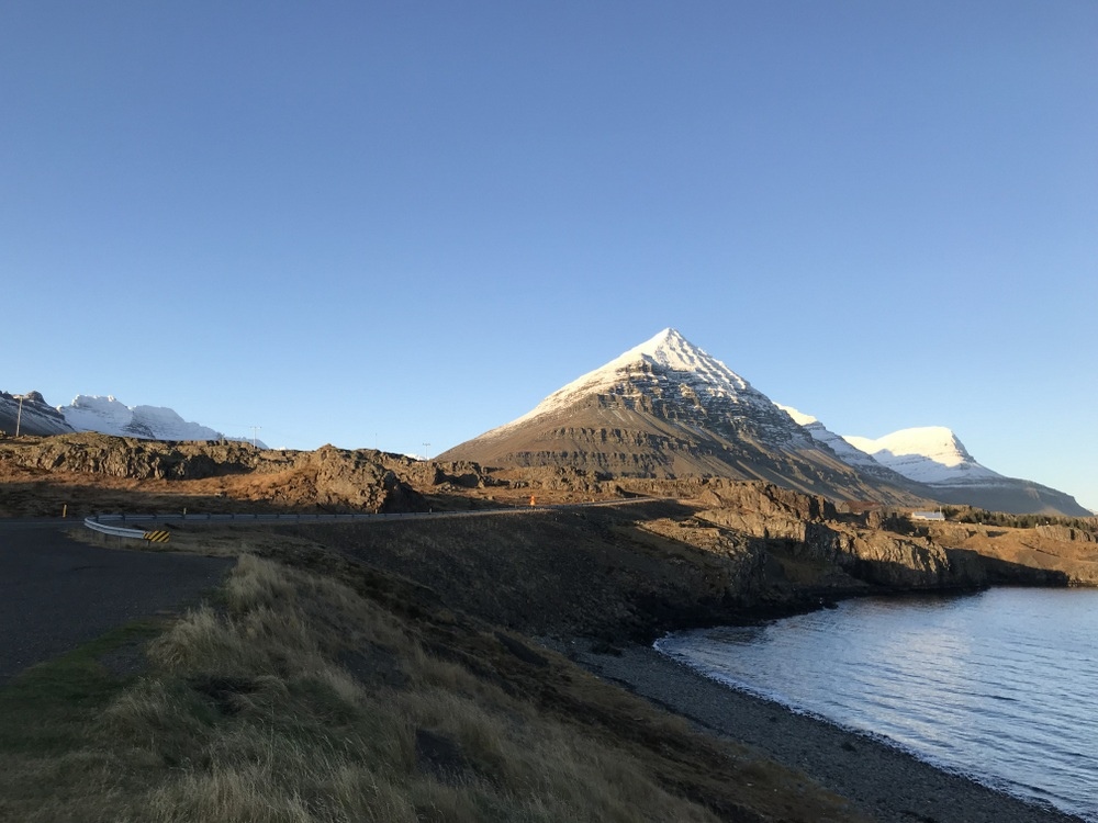 從Hofn鎮往北約1個半小時車程,會到達東部一個古老的小漁村Djúpivogur,它又被稱為神山小鎮是因為附近有一座金字塔形的山脈Bulandstindur,根據了解這座山有800萬年的歷史,由玄武岩地層形成的,海拔1,069米,可以攀爬但無明顯路徑可循;你不一定要到小鎮停留,因為金字塔是在環島自駕的必經路程上,看到金字塔後隨意找個空處停車欣賞即可