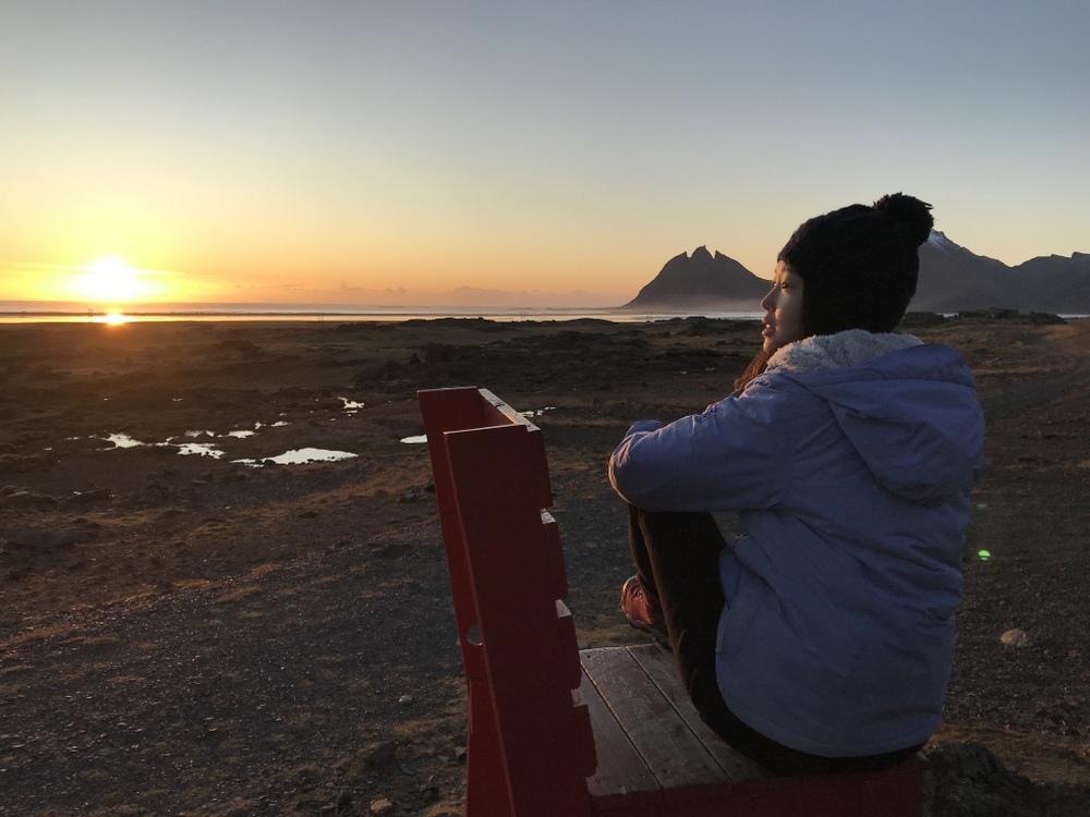 冬天日照縮短,11月的冰島日出時間約落在早上9~10點,從Hofn鎮上出發沿著1號公路行駛,沒多久太陽升起,然後意外發現路途旁有個小山丘上擺著一張紅色椅子,於是就停下車來欣賞,大家還記得在景點介紹(上) 第十三個景點中的蝙蝠俠山Brunnhorn,從這個角度望過去不覺得更像那個標誌