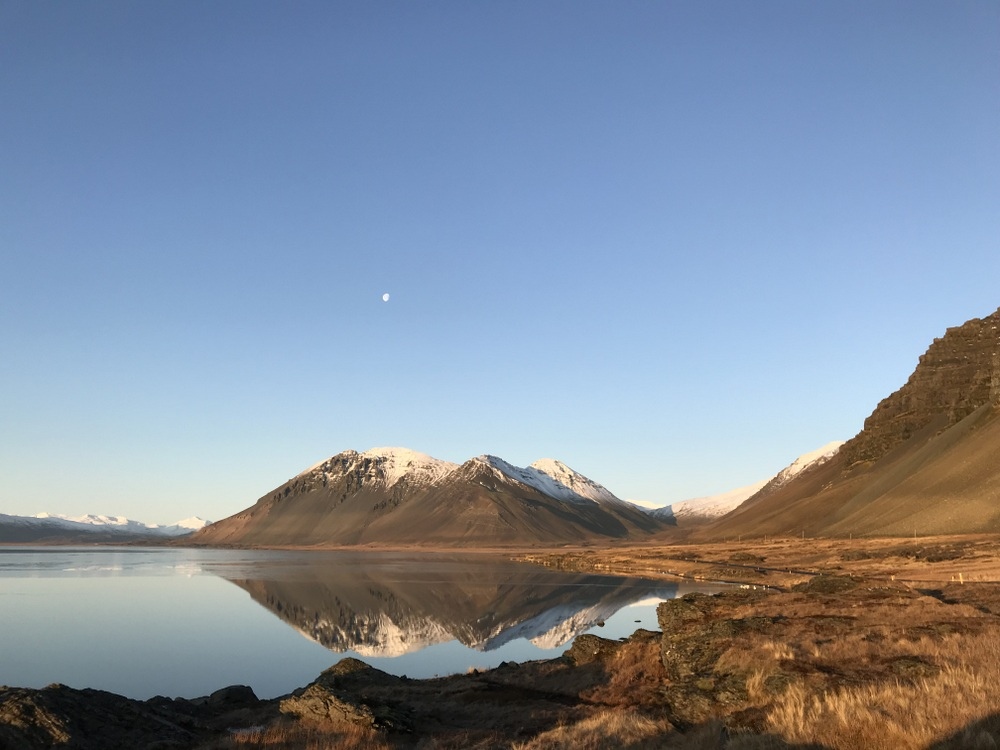 離第一個介紹的地方約30分鐘車程,這處的景致更令人驚嘆,在天濛濛亮時看到那一抹高掛的月亮,眼前的山脈白了頭,完美倒映在水面上實在是美不勝收,「心之所向,身之所往」