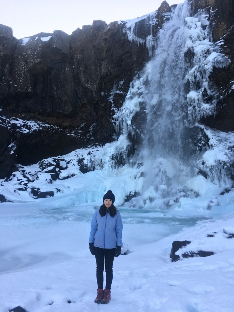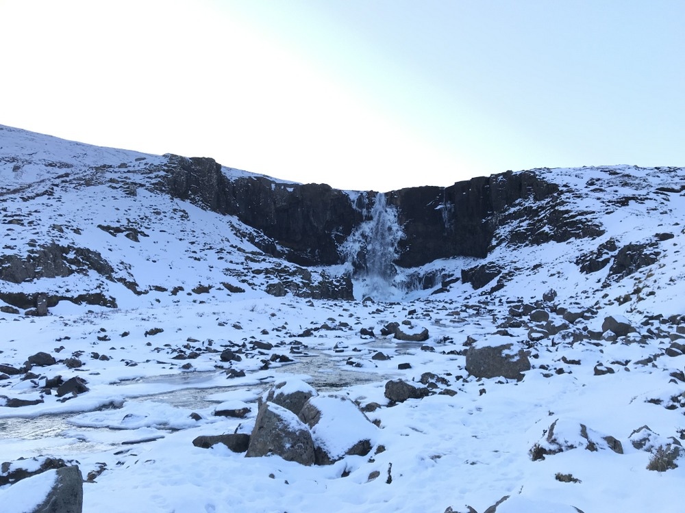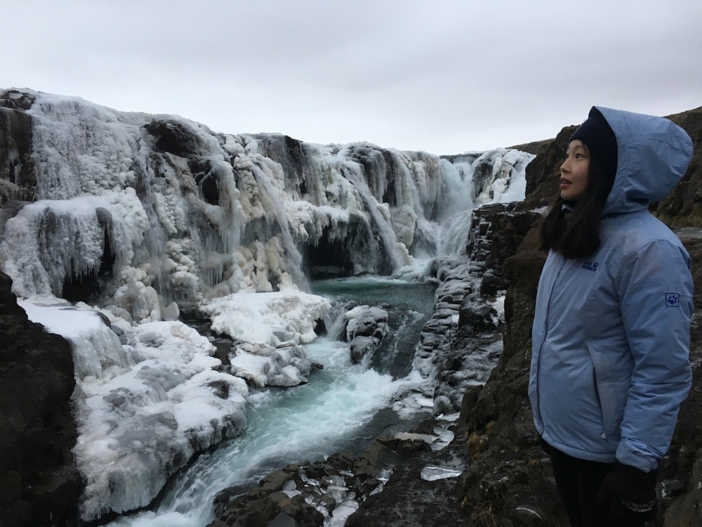 瀑布就在道路旁不遠處,有處空地可以停車,步行約5分鐘能到達瀑布正前方,11月中瀑布周圍都已結冰,在行走時千萬要小心滑倒,近距離觀看真的好美不時還會被水花噴到傳來一陣涼意,而93號公路橫穿高原,海拔直達600多米,一路風景優美,由於高緯度加上海拔高夏季仍能看到積雪