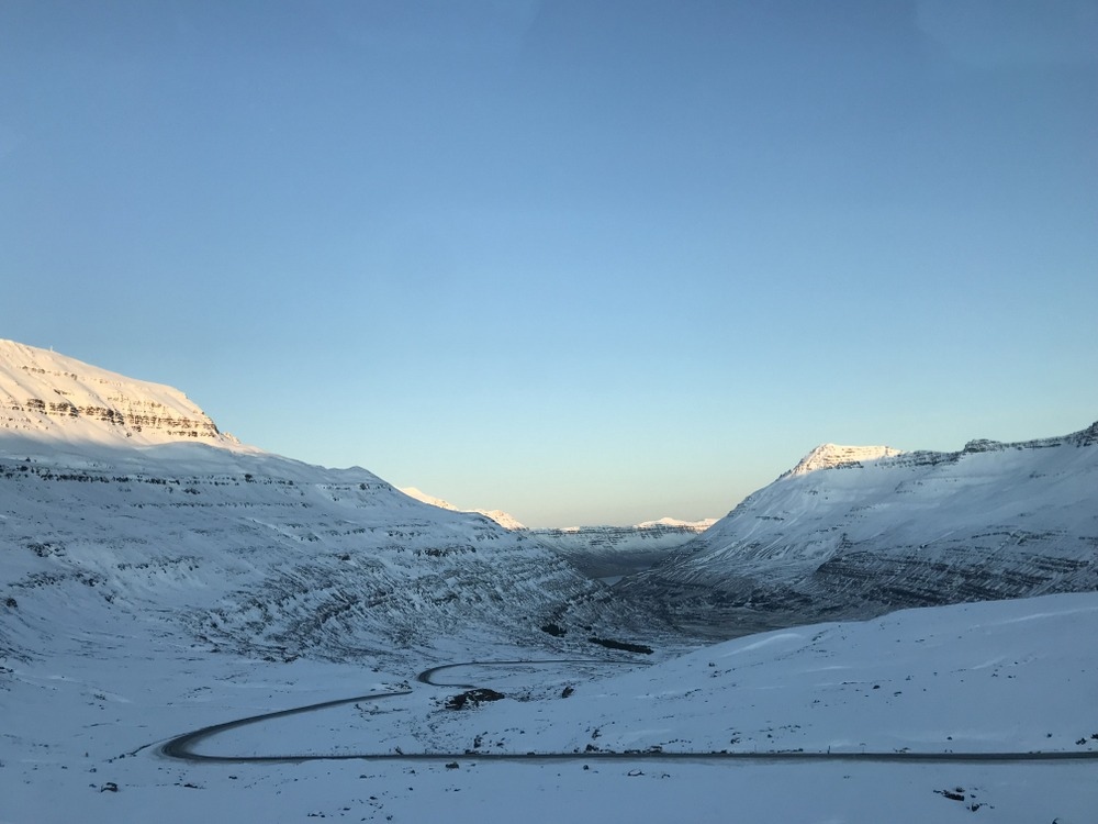 過了Djúpivogur鎮,沒多久兩旁的景色已轉換成一片冰天雪地,兩個小時後來到冰島東部的「大城市」埃伊爾斯塔濟Egilsstaðir,雖然說是大城市但仍是相當寧靜,記得在此採購生活所需的補給品,過了這個村就沒那個大型超市啦!