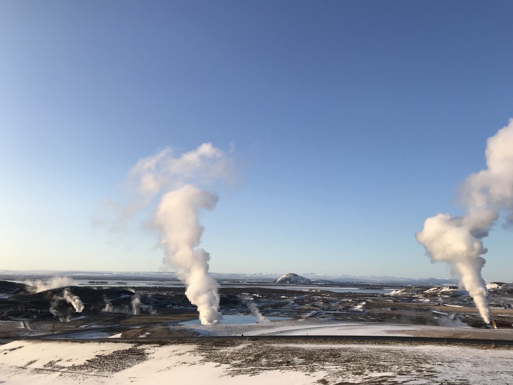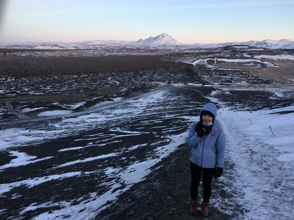 米湖是冰島北部最大的湖泊,由於周圍火山活動異常活躍,形成多個地熱區,其獨特而美麗的地質環境,從高處眺望湖泊和巨型煙囪直衝天際的霧氣景色令人驚嘆。周圍的景點:Krafla火山湖(11月中已被雪覆蓋完全看不到)、Hverir火山地熱谷(個人覺得比北投地熱還弱)、米湖溫泉Mývatn Nature Baths