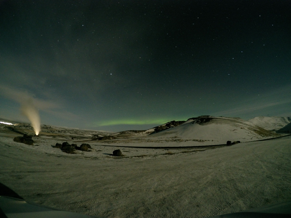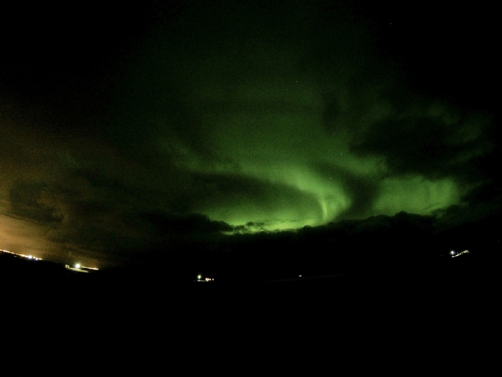 雖然前晚才經歷道路救援但仍沒有打壞我們追極光的心,在米湖我們第一次看到極光,但沒有很明顯一直不確定是不是,它看起來就像會發光的雲,用Gopro4長時間曝光,才有上圖這樣的效果,有點小失望~