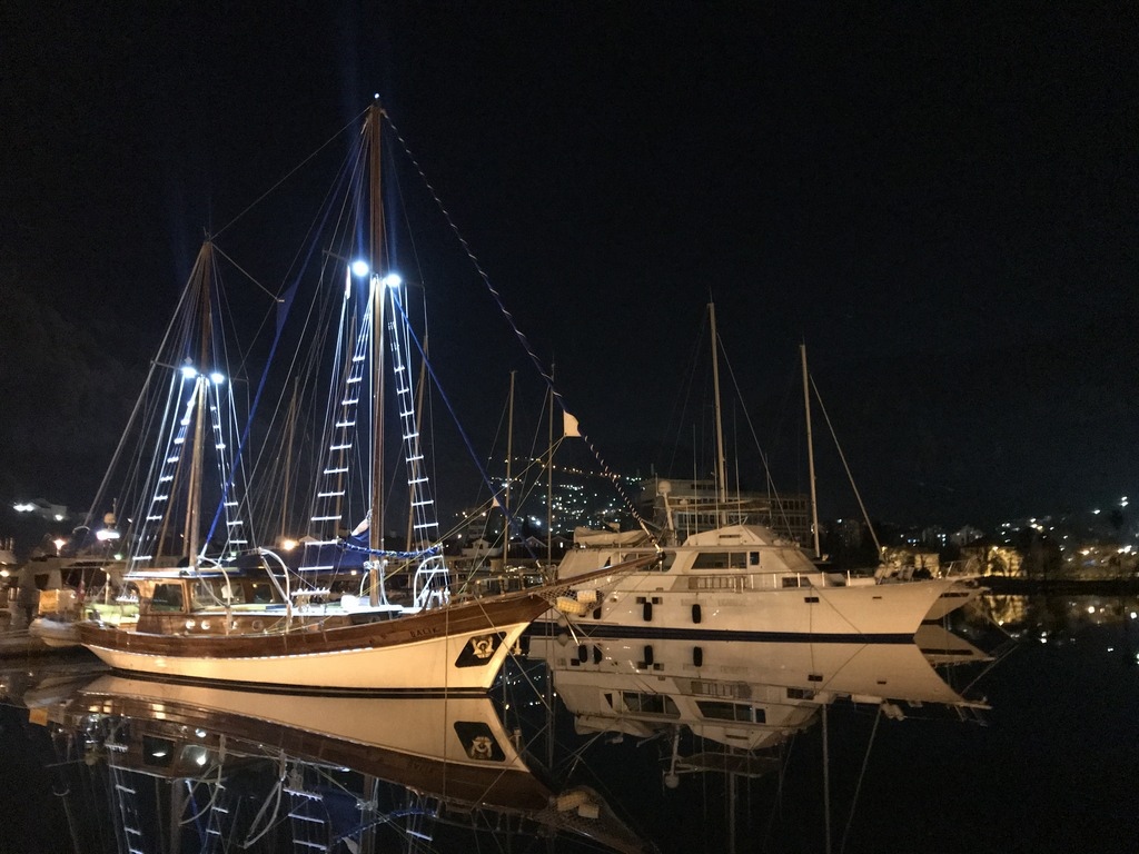 晚上可以沿著港灣走到老城區對面,山城的燈光照映在水面,說巧不巧就連成一顆愛心的形狀,拍攝的位置 42.423417, 18.761288,我是用手機拍的夜景功能不是很好