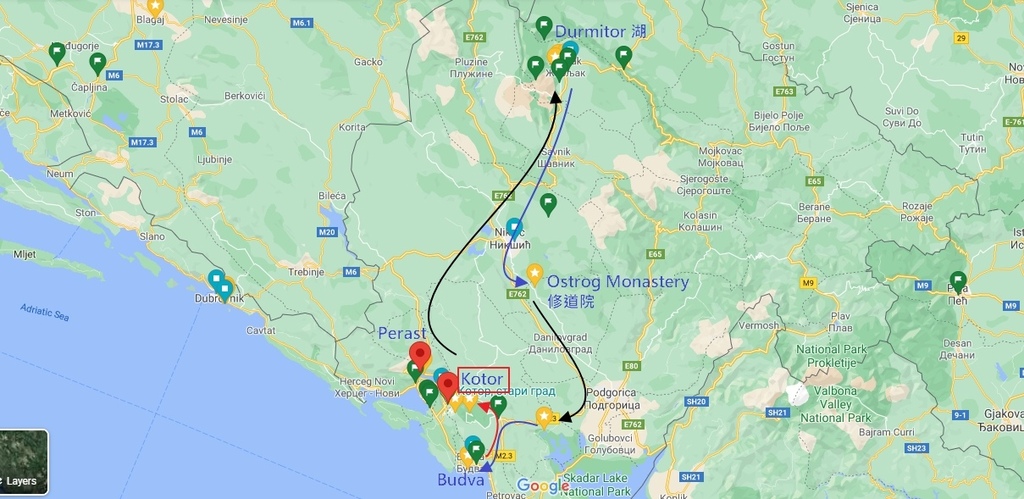到了Kotor城市待了兩天後,我們租車往蒙特內哥羅其他地區觀光為期四天三夜,路線為上圖最後回到Kotor,最後搭巴士離開去克羅埃西亞的Dubrovnik城市