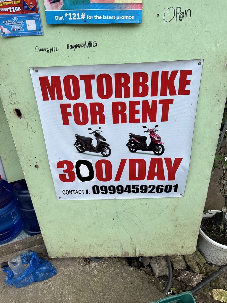 薄荷島租機車的價格一般是400P / 天 ,依機車的狀況和馬力價格也會微調,我是在住宿附近的雜貨店租機車,他就只租 300P / 天,100C.C ,現場就是跟圖片一樣的兩台車(黑 / 紅色),沒有押證件只拍護照存證 薄荷島哪裡可以租: Tagbilara港口、Alona Beach附近都可以找到出租店 在菲律賓租機車很簡單: 1.不看國際駕照 2.有些會要求押證件(可以帶國內駕照、絕對不要押護照) 3.還車沒有嚴重受損時,只會看油是否有全滿 騎車路線: Alona Beach – Philippine Tarsier Sanctuary 眼睛猴保護區 -人造森林- 巧克力山 – Alona Beach加油費用:297P