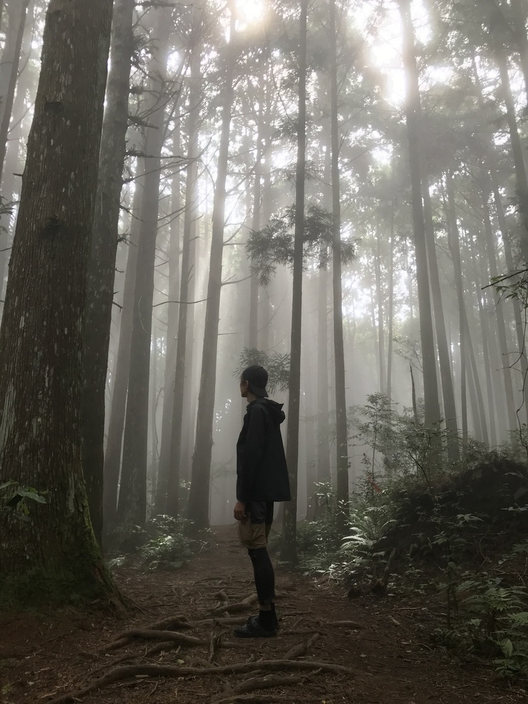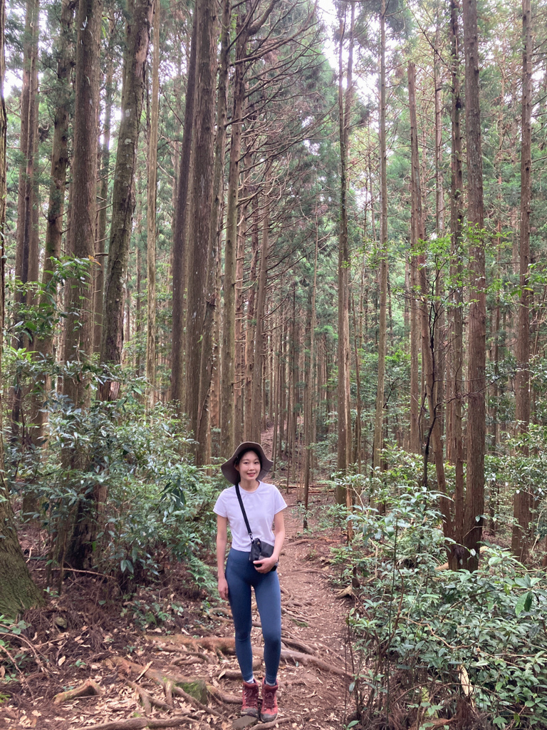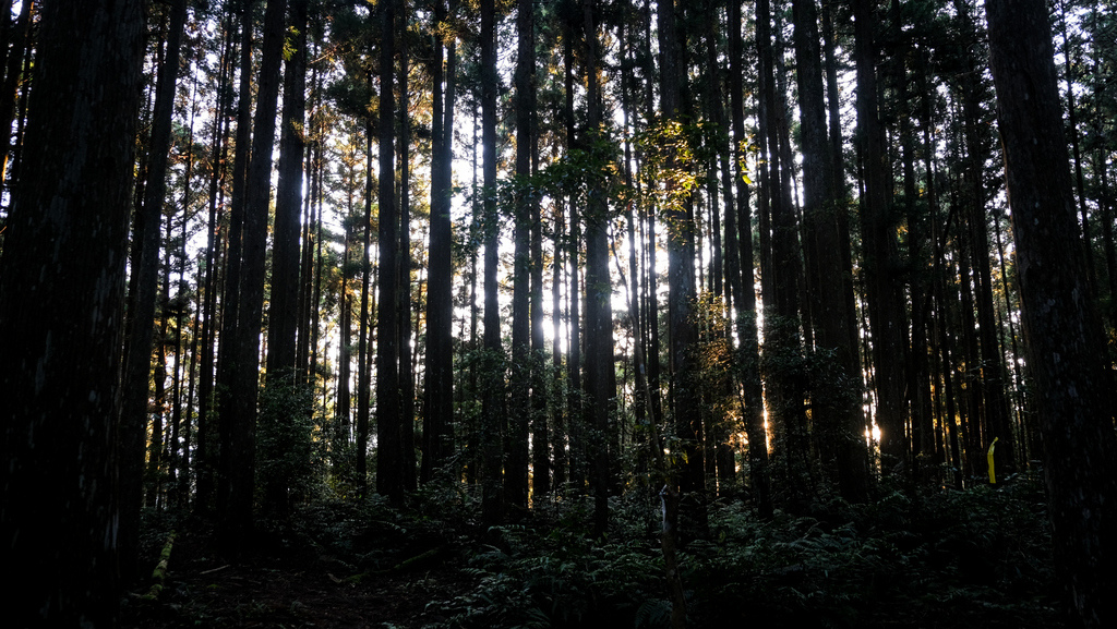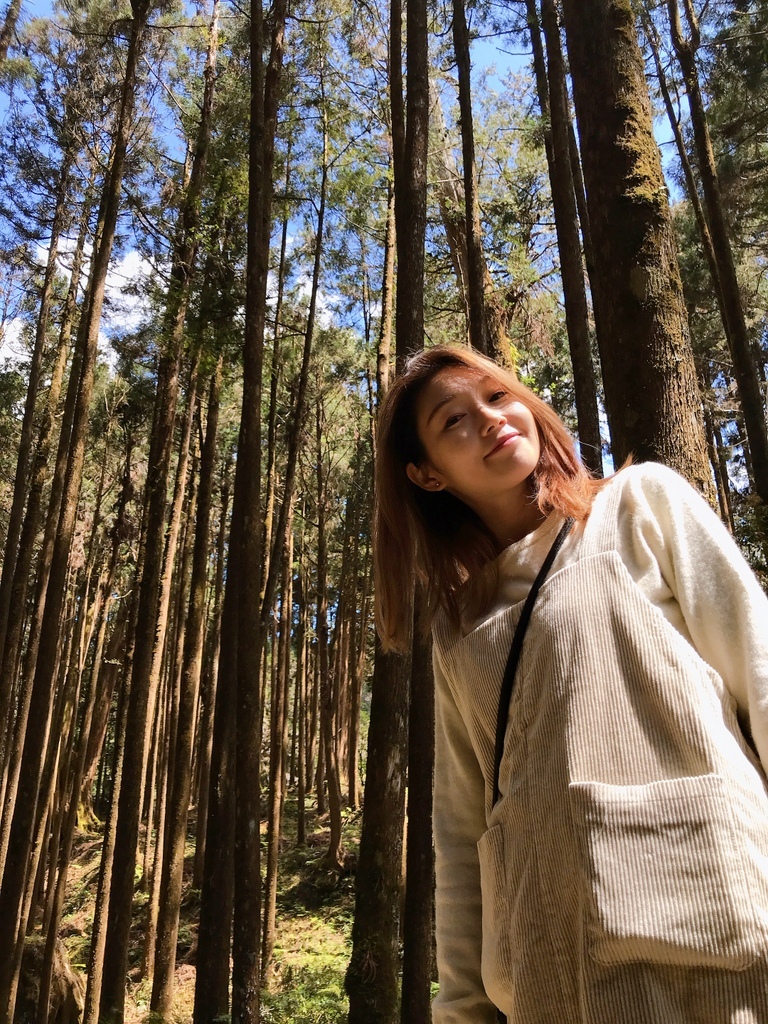 前段的步道有許多人工柳杉林樹,陽光灑落在樹林間相當美