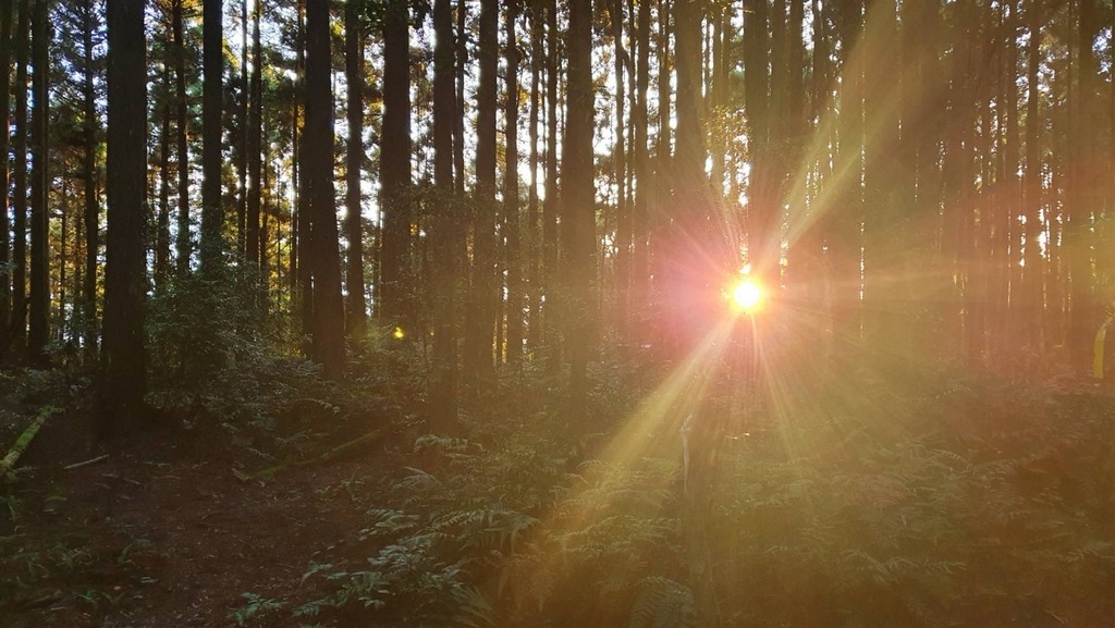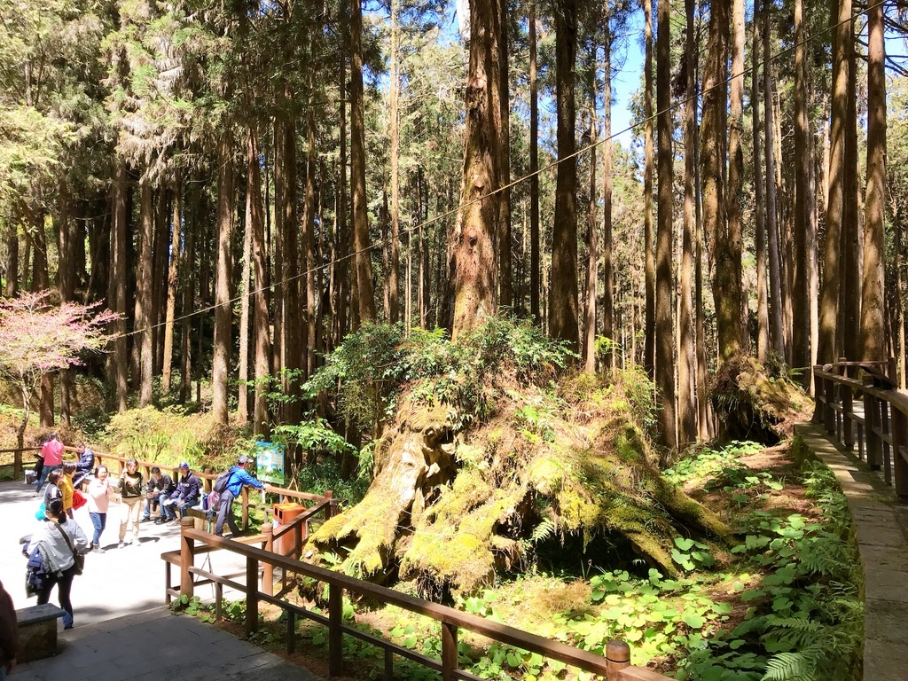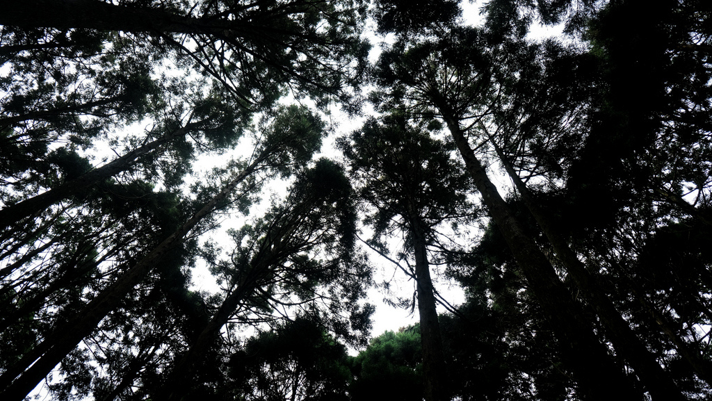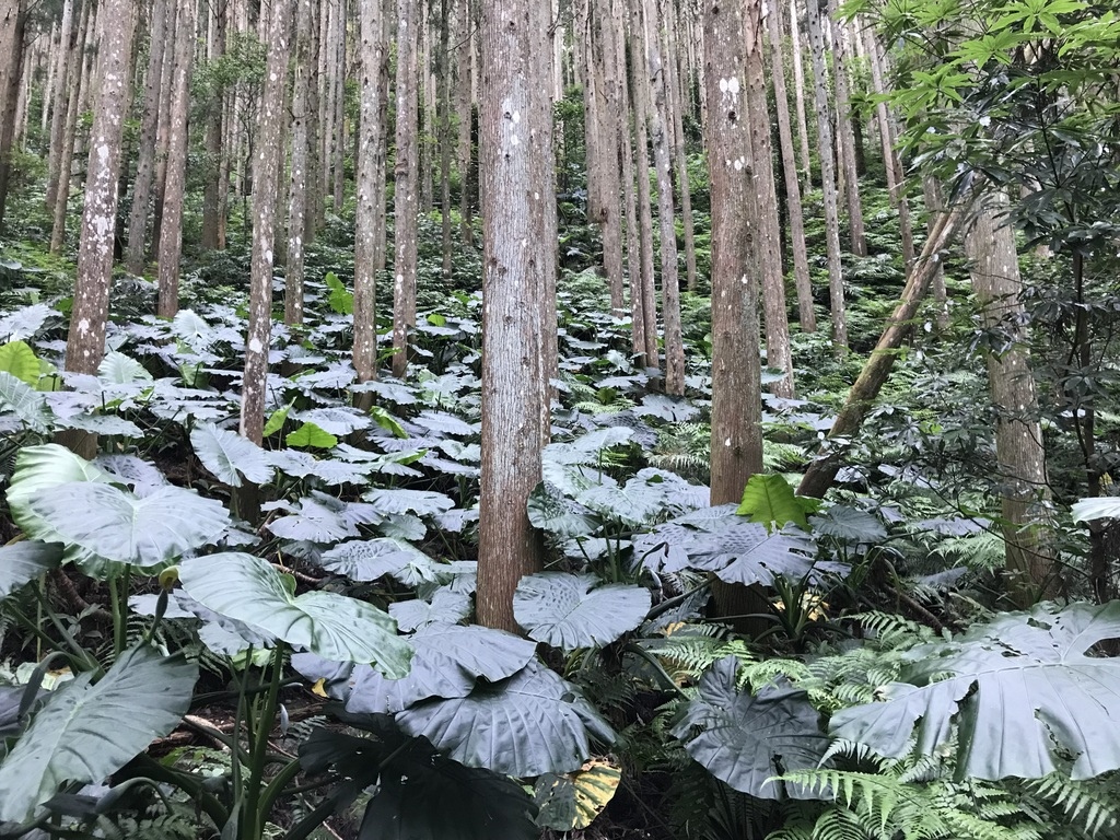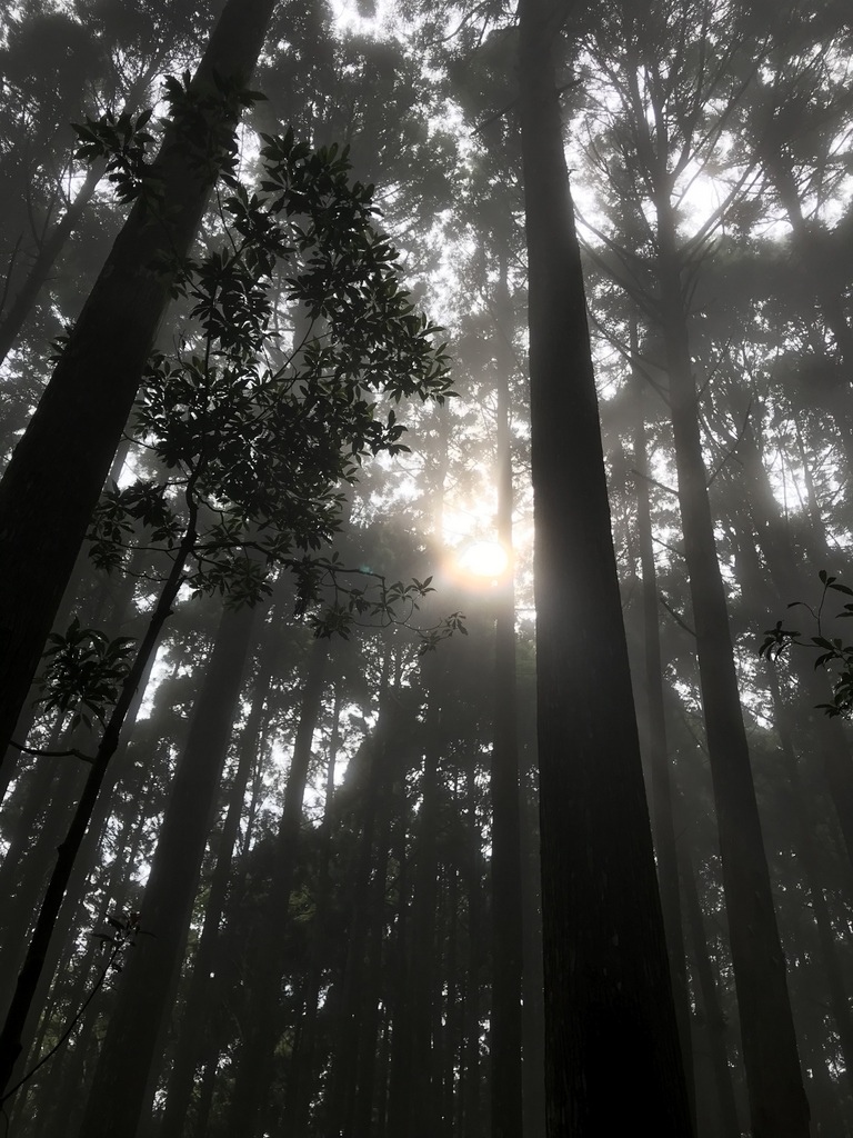 前段的步道有許多人工柳杉林樹,陽光灑落在樹林間相當美