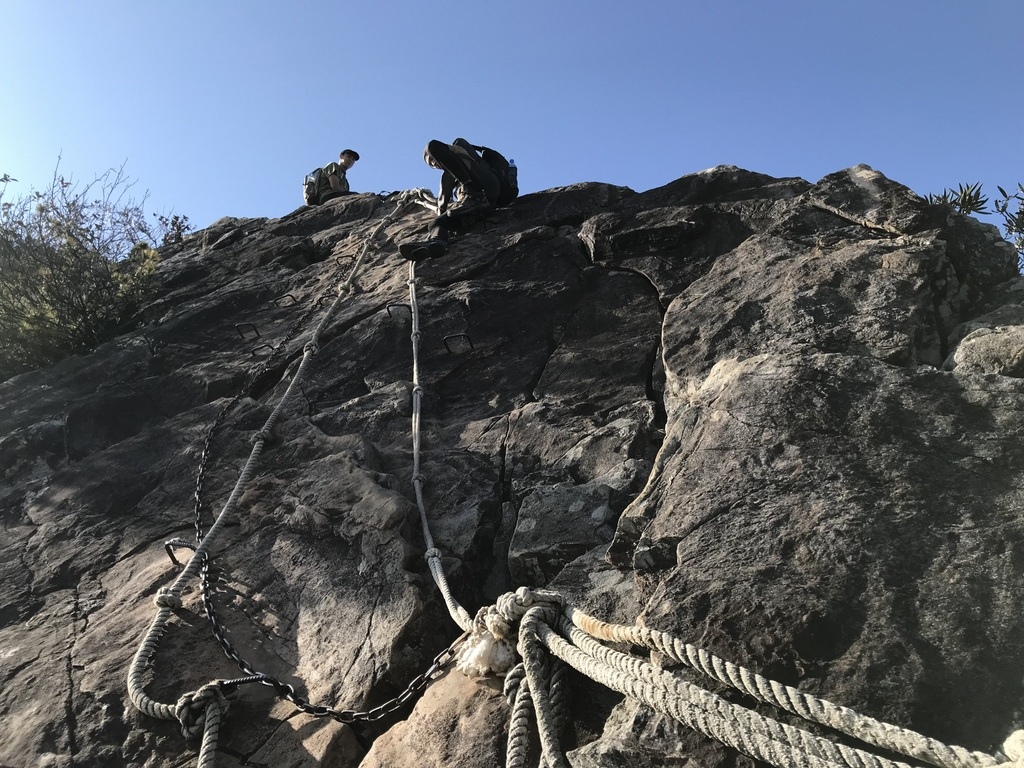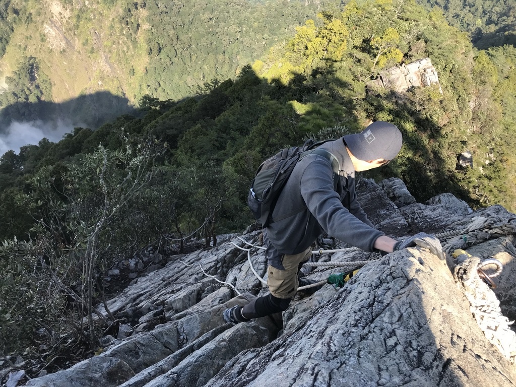 最後來到攀岩區域,陡峭的山壁幾乎是90度垂直,踩點不好找,需要臂力和不懼高的勇氣,尤其重裝更為難爬