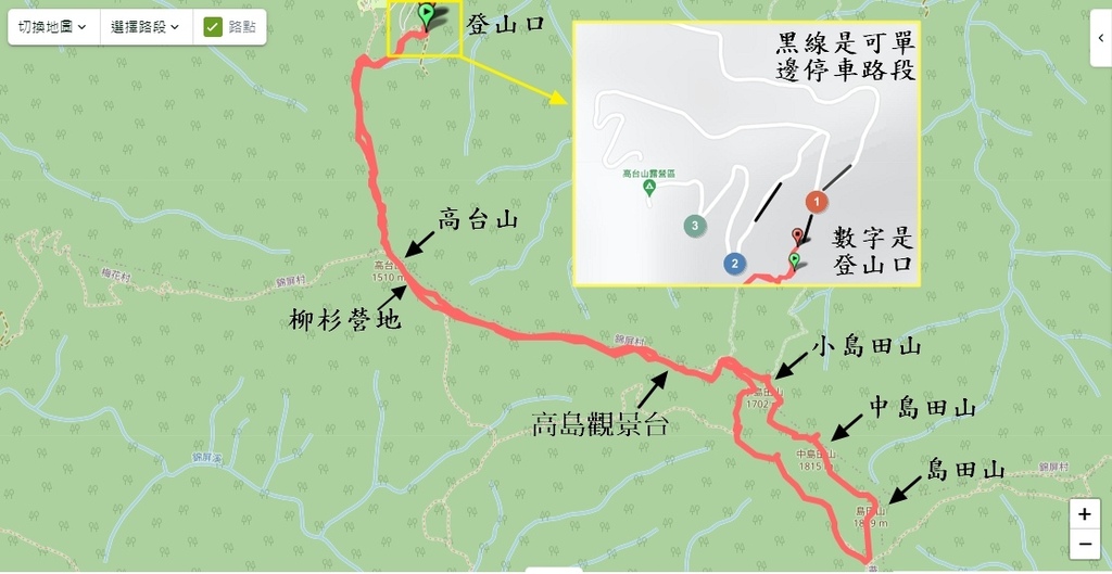 編號1-7號是上坡,7的位置是哈堪尼山,編號7-10 都是下坡,10的位置是風美溪,也是今天紮營的地方