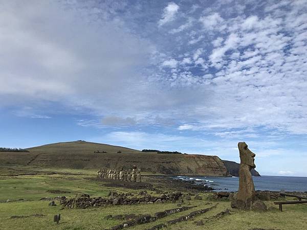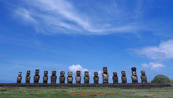 島上唯一看著海的七個摩艾石像,據說有天文學的實際用途,這裡也是個觀賞日落的景點,大多的石像高7-10公尺,重量從20噸到90噸,最重的竟然達200噸,以當時的科技和人力無法製造完成這些神秘石像,因此被懷疑是外星人或巨人所造