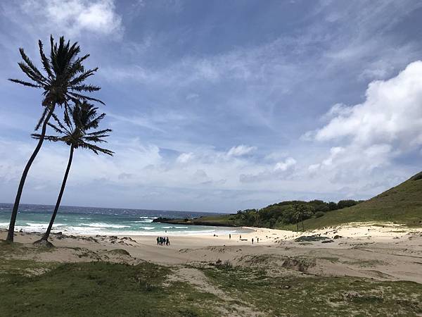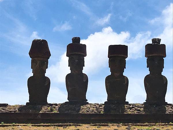 位於這個沙灘的不遠處有一排4~6個的摩艾像,其中四個有戴帽子,可惜的是這些摩艾像沒有保存完好,有的只剩軀幹