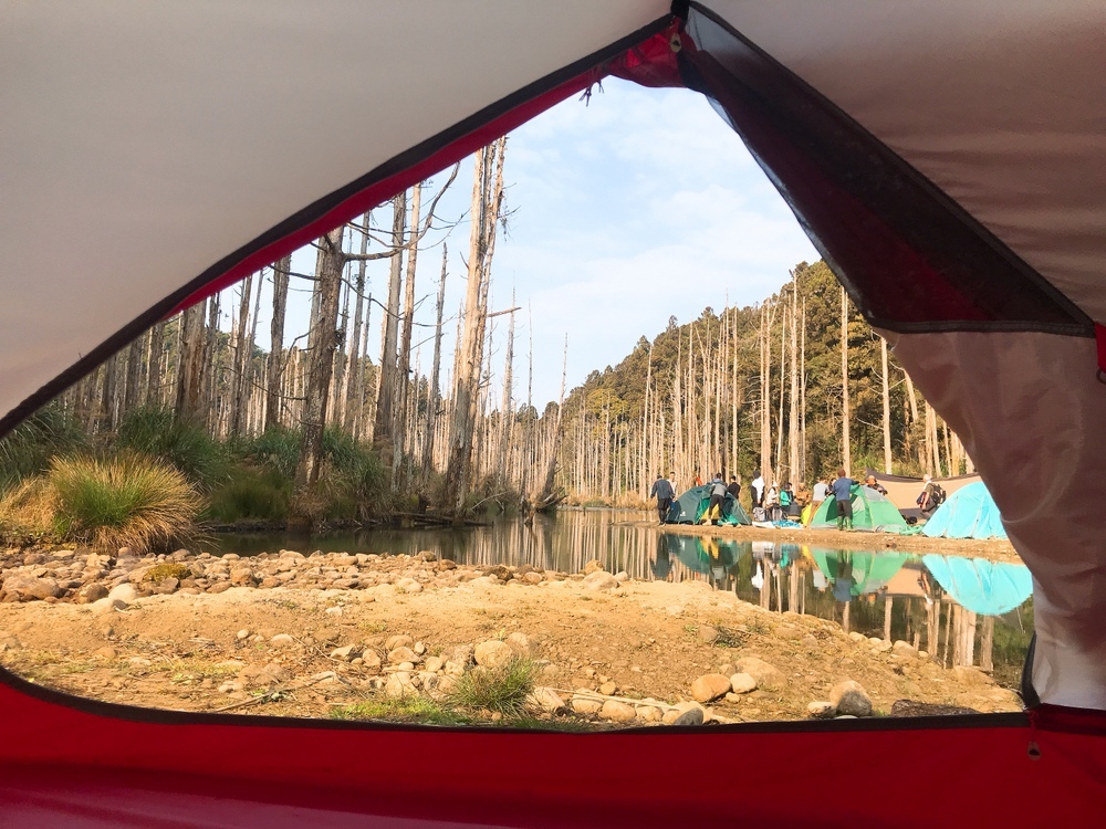 當你看到寫著無痕山林告示牌就代表,柳杉林營地到啦!這邊腹地相當大且平坦,可以容納將近三十頂帳篷,選擇在周五來露營的人不多,加上我們只有兩組人馬
