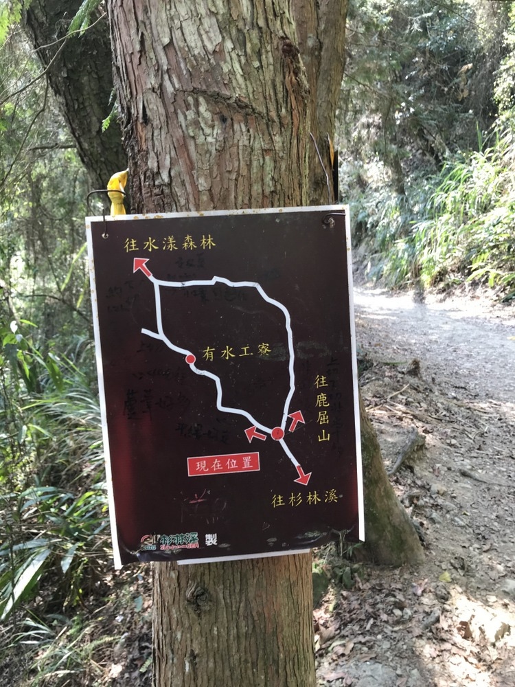 第一登山口有一塊無痕山林的告示牌,往右陡上才是今天真正的起點,步道的樹木上也能看到一堆布條