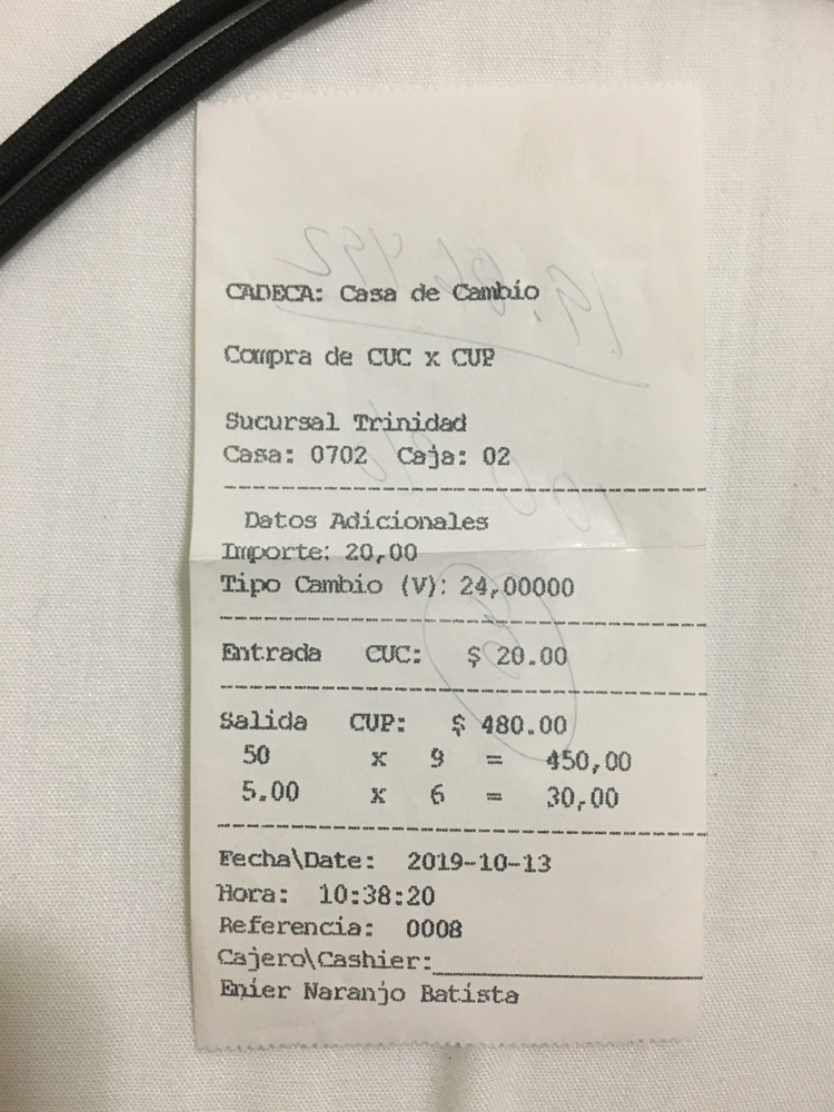在古巴市區或各地區域可以尋找CADECA換匯所,營業時間比銀行來的晚,也不會大排長龍還能換CUP,有成功在千里達Trinidad拿CUC換CUP,以下是換匯收據1CUC換24CUP