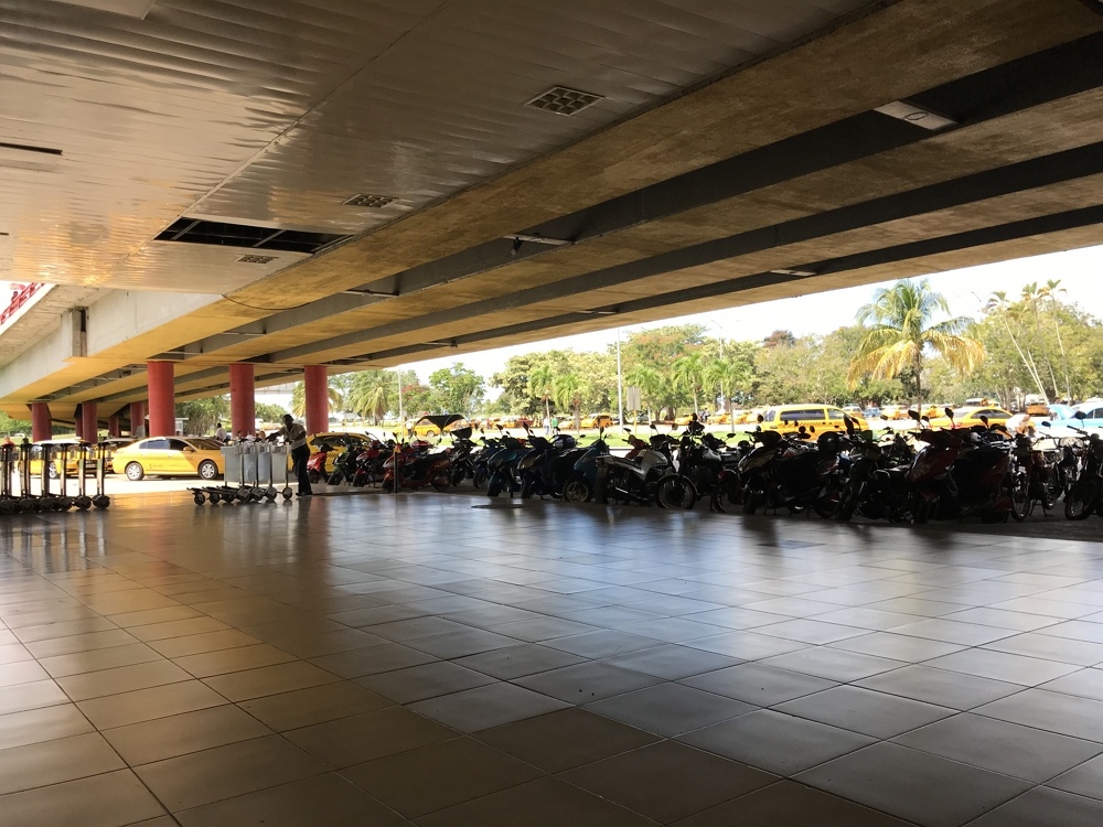 哈瓦那國際機場T3出大門後左轉,在上圖第一排三根紅柱後方處搭conexión接駁車,那一排計程車司機會騙你說沒有接駁車,其實是有的只是大家都不知道要等多久,像是我早上十一點出機場等到下午一點接駁車才來,等到都懷疑人生了,接駁車車資0.4CUP/人