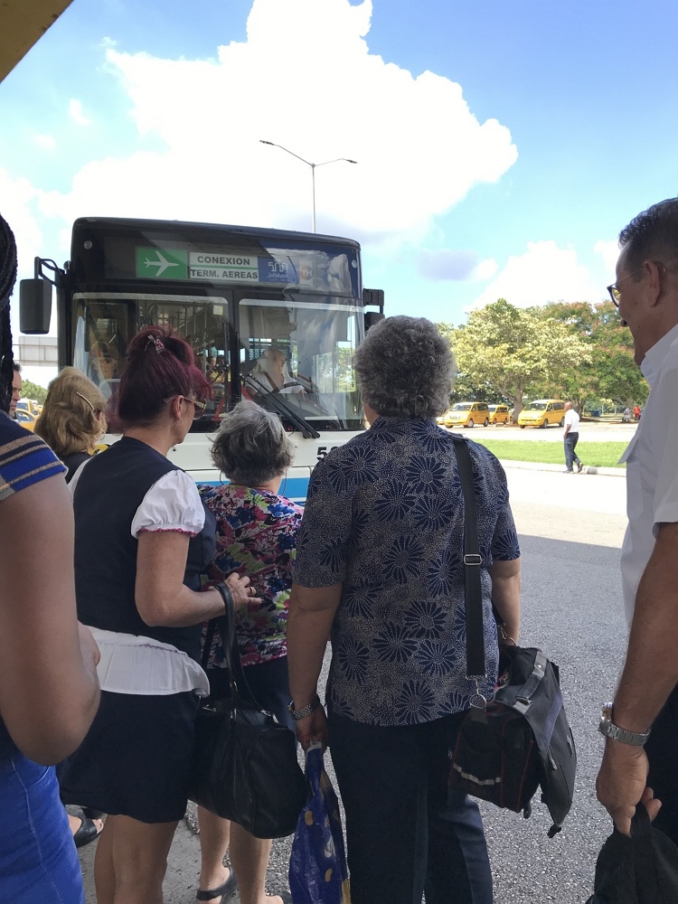 接駁車會到機場的T2,當右轉到Avenida Rancho Boyeros街道第一站下車,過馬路到對向公車站轉搭P12(舊城區)、P16(新城區)進市區,車資0.4CUP/人,可給1CUC但不找錢