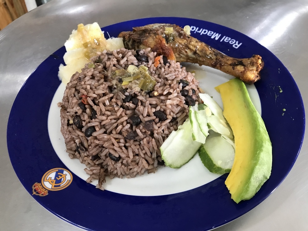 當地人吃的便當,選擇想要的肉類後,配料是紅豆飯、木薯、酪梨、幾片小黃瓜