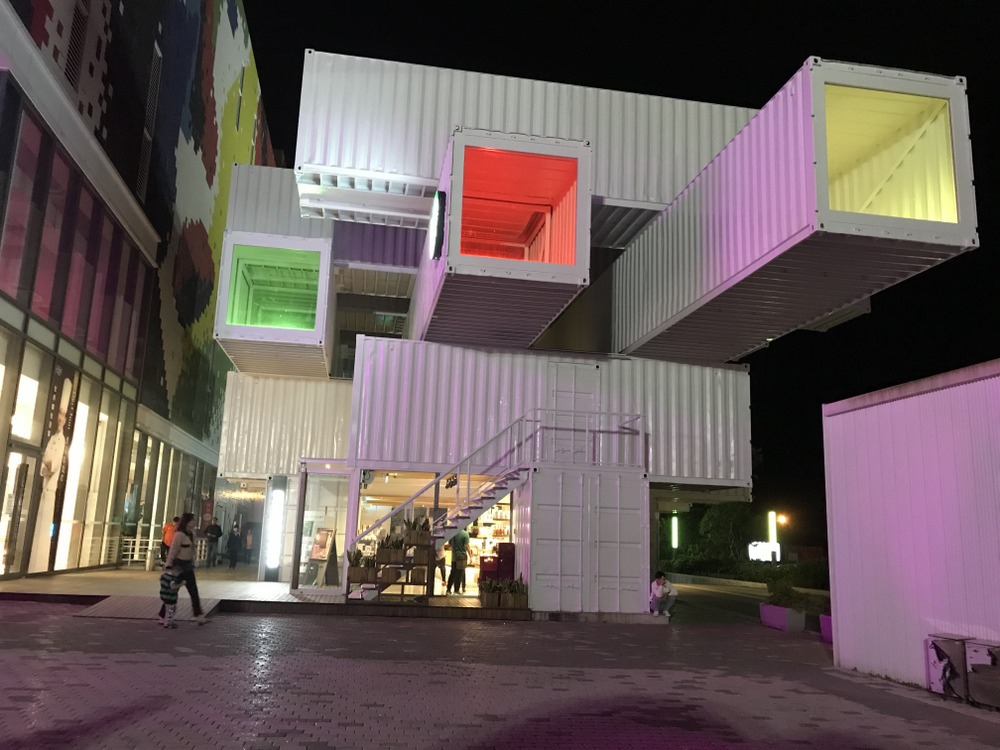 晚上的貨櫃屋會一直變換不同的顏色,當你拍完照別急著走,星巴克50公尺外有家排隊名店【玉里臭豆腐】,吃起來真的很不一樣