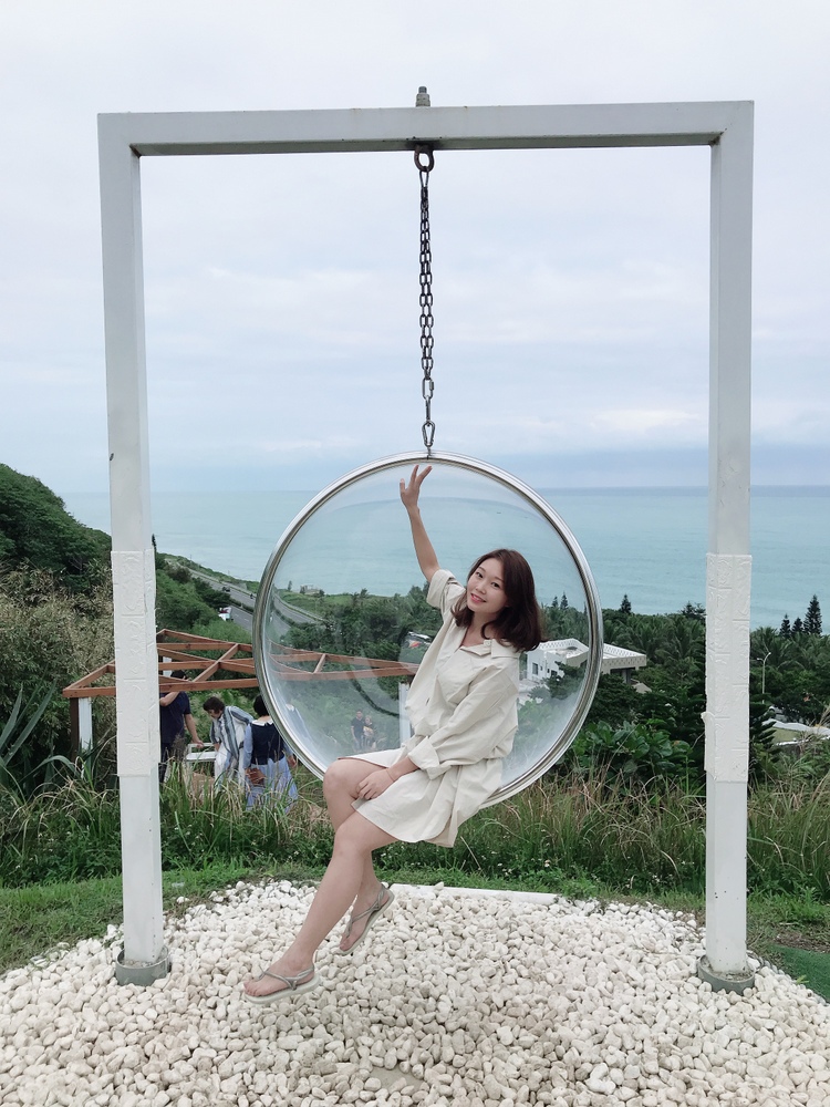 花蓮人氣超夯的觀海咖啡廳,是許多網美們的IG打卡勝地,在半山腰處設置玻璃半圓形鞦韆,欣賞著東海岸線景色,其他還有十多個三角木帳篷,營造戶外露營風