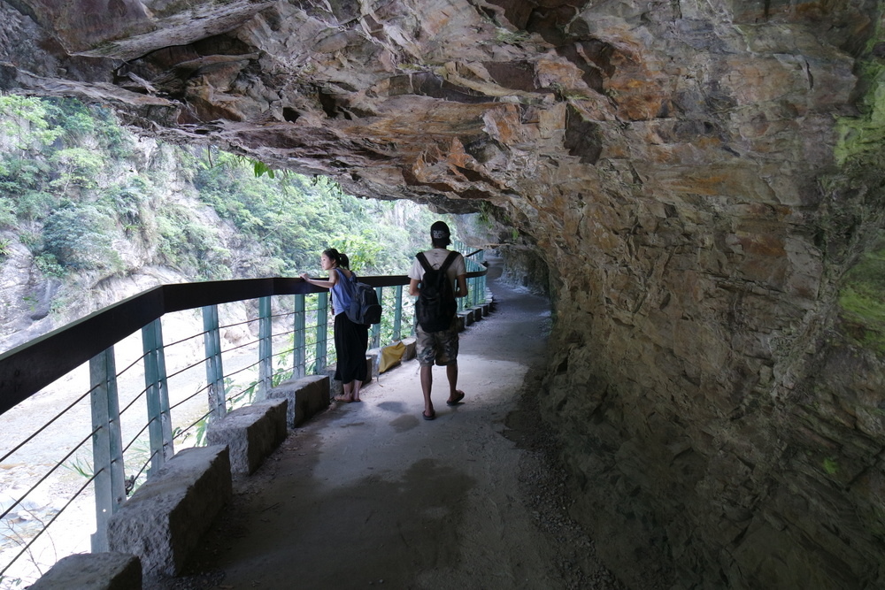 步道很特別的是依著山壁鑿出,全程有遮蔽處不會曬到陽光,一邊是山壁一邊則是蜿蜒的溪河