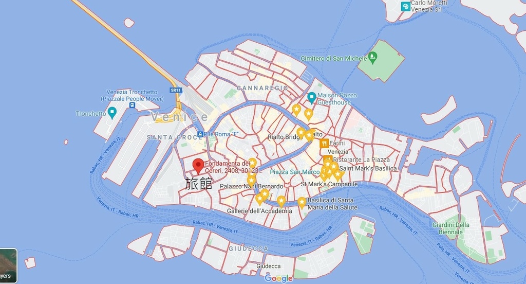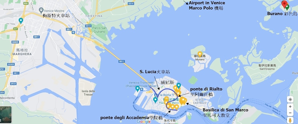 當初在找威尼斯的資料時可是花了很多時間,因為它是瀉湖地形,交通往來以船為主,無法想像距離的遠近,所以首要搞清楚的就是地理位置,藍線為主要水道