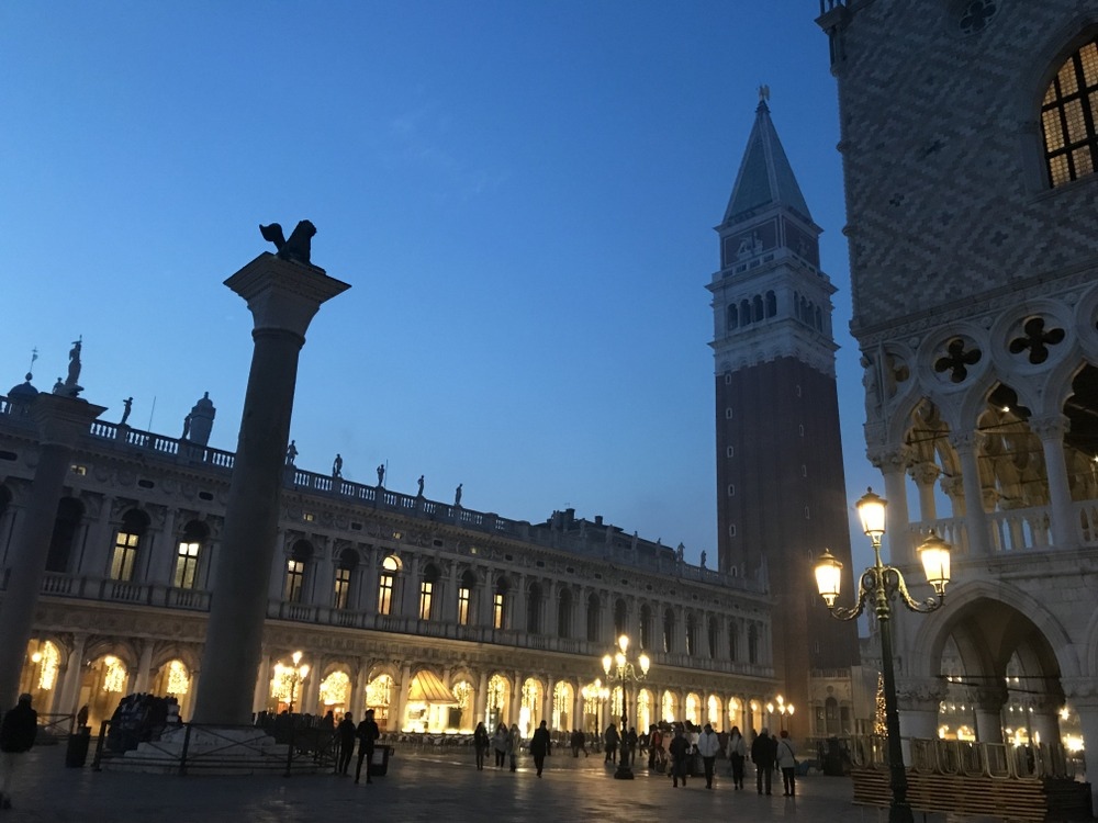 夜晚的聖馬可廣場,繼續往前走100公尺就能到達聖馬可大教堂