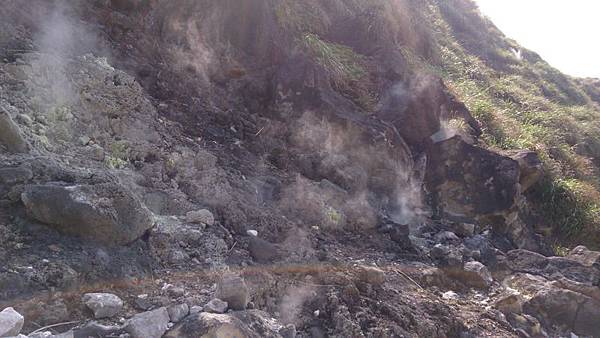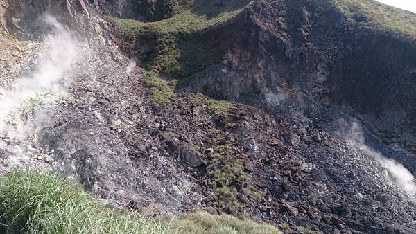 在小油坑下車就能聞到空氣中瀰漫著硫磺味,從登山口到七星山幾乎都是持續上坡的樓梯而且相當陡,沿途也有多處地熱冒出的白煙