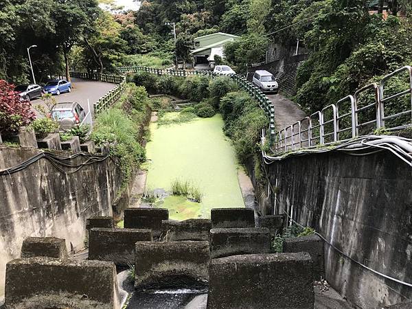在「貴子坑水土保持教學園區」的外側,有整治過的水磨坑溪,整條溪被分階以減緩水的沖蝕力,這就是水土保持工程裡的「跌水」工程