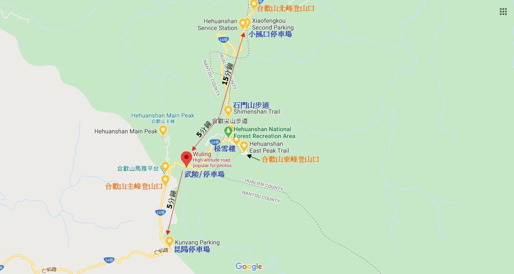 停車場:在合歡北/西峰登山口有少數停車位;小風口休息站或小風口遊客中心停車場,步行至登山口約10分鐘