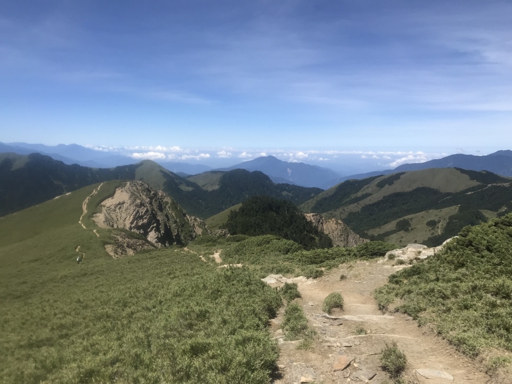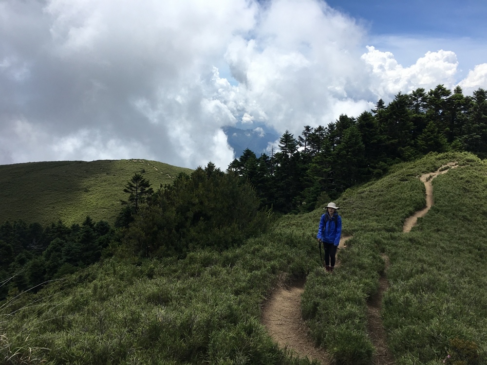 我在4.8K處,手指比出來才不會忘記,回程一樣是起起伏伏的山勢,進入山林又再走出到一片遼闊山景,總有不同的驚喜在這步道上;前天沒睡好早上又起床看日出整理行李有一度爬到快睡著,越接近北峰山勢又更加險峻體力消耗超快,下午五點終於到達北峰