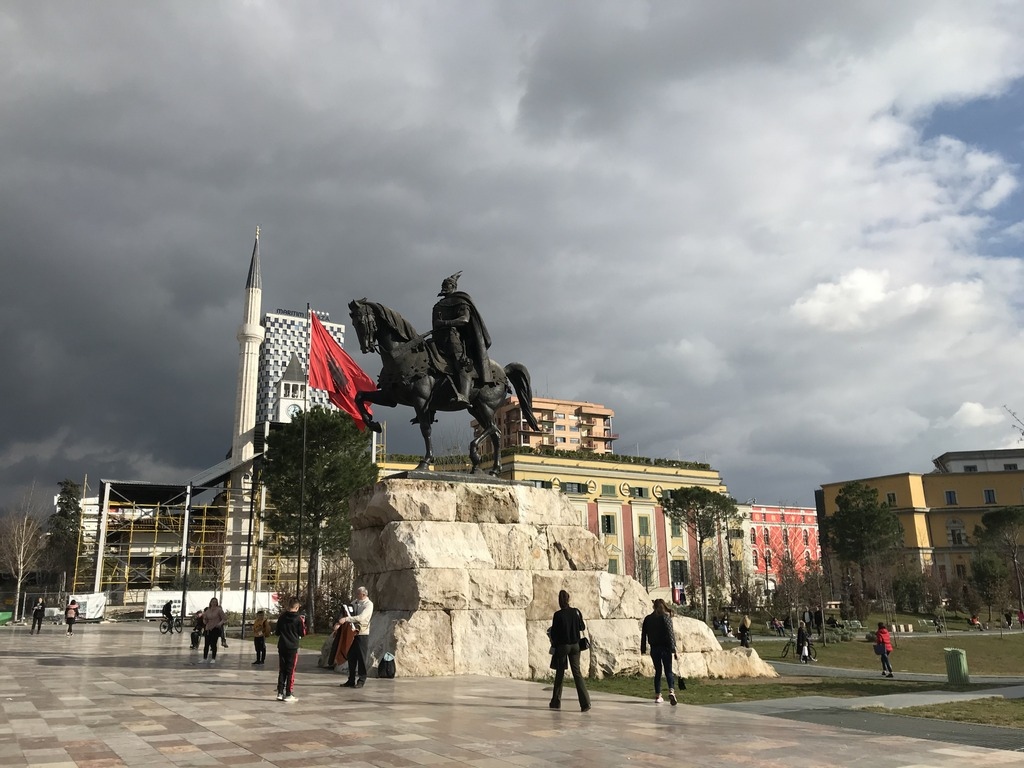 斯堪德培廣場是 Tirana 市中心的重要地標之一,廣場中央立著民族英雄斯坎德培(Skanderbeg) 騎馬的銅像,廣場也以他命名