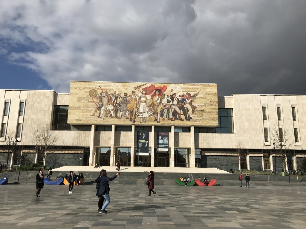 博物館建築正面上方的巨幅馬賽克鑲嵌壁畫相當醒目,充滿濃濃的共產主義風格,描繪阿爾巴尼亞的歷史演變到第二次世界大戰一起保衛國家而抗爭